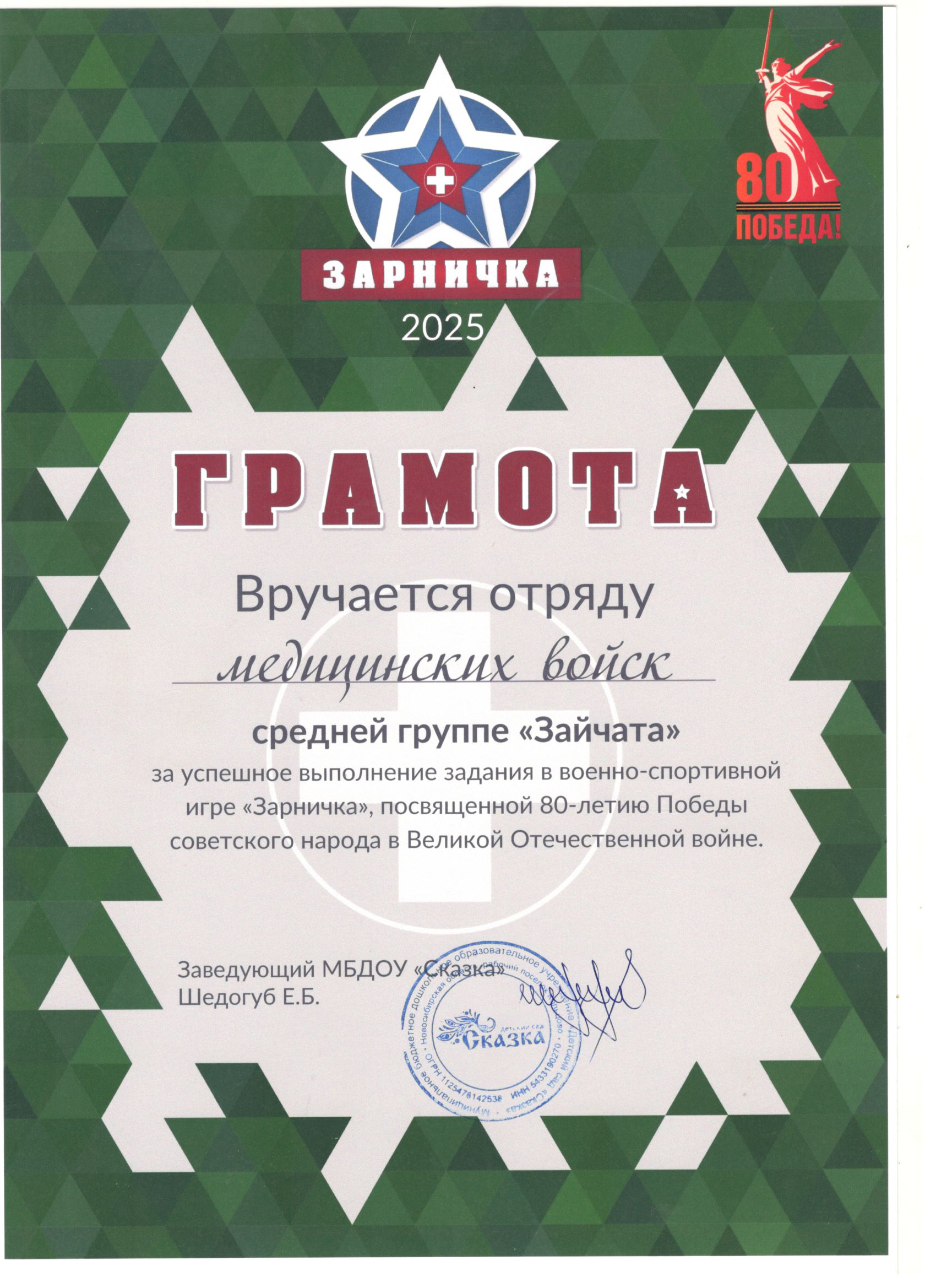 Благодарственное письмо администрации МБДОУ Сказка 2024г