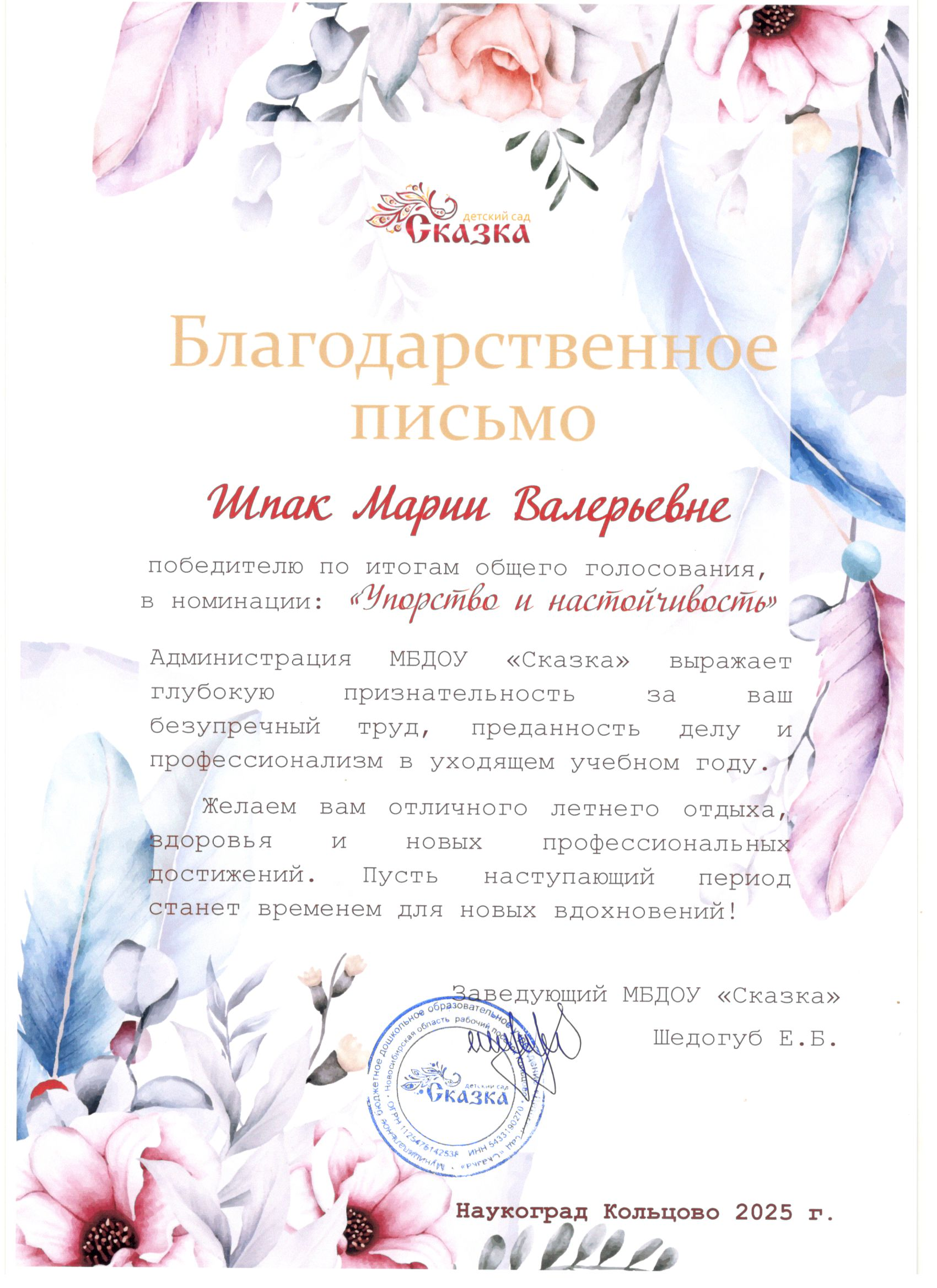 Благодарственное письмо 2025